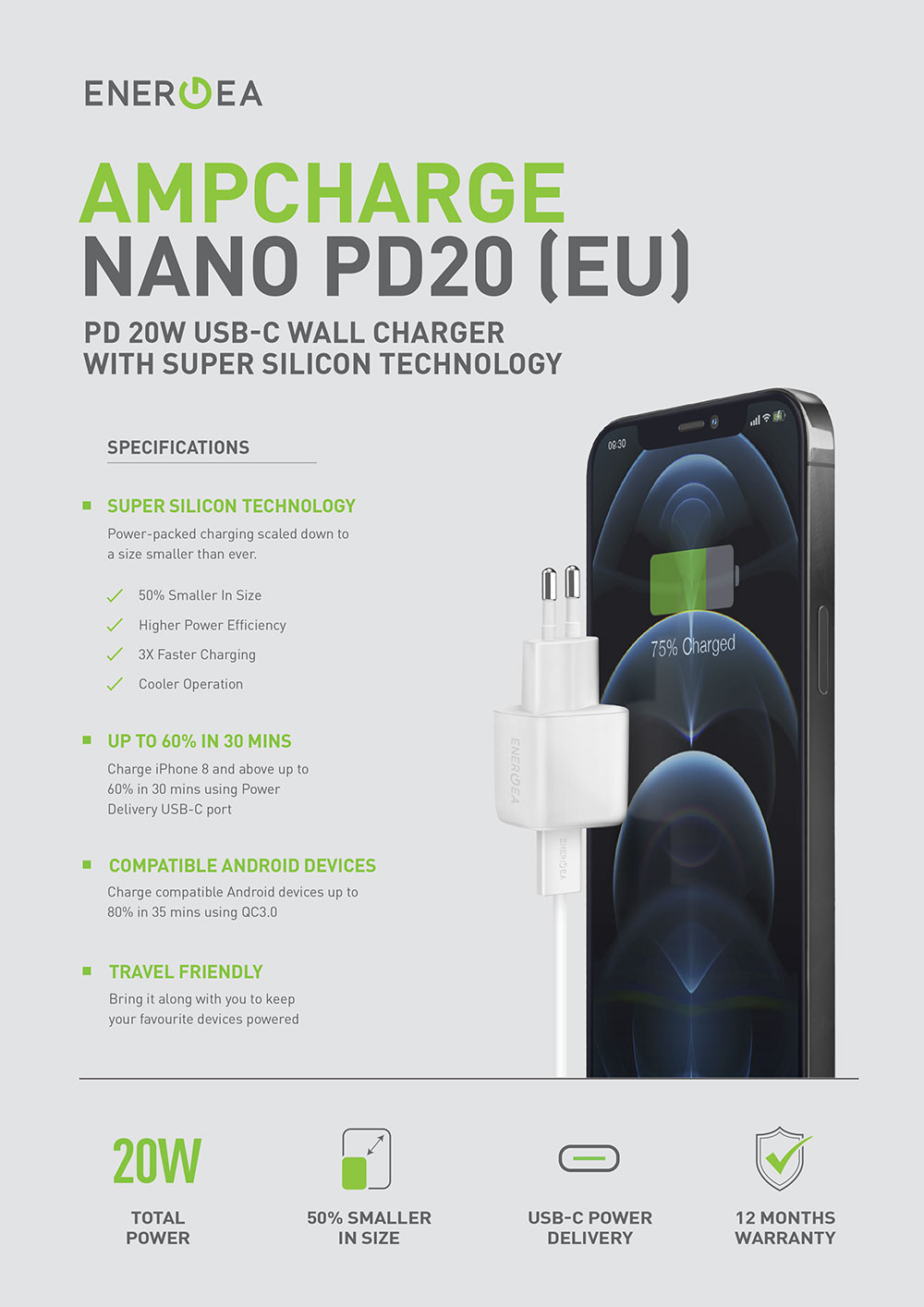 این شارژر کاملا برای گوشی های آیفون سری 12 و 13 استاندارد و بهینه می باشد و البته می تواند تمامی گوشی های آیفون از سری 8 به بعد را بصورت کاملا هوشمند شناسایی و مطابق با توان آن شارژ نماید . ابعاد کوچک این شارژر که تا 50%  کوچکتر از شارژر های معمولی طراحی شده است و توان شارژ سریع تا 3 برابر بیشتر از شارژر های عادی در کنار تکنولوژی بکار رفته در این محصول که توسط انرژیا طراحی شده و به خنک شدن شارژر در زمان شارژ سریع کمک می کند . توانسته است Energea AmpCharge Nano PD20 را به یک انتخاب ایده آل مبدل نماید . این شارژر یک درست برای افرادی است که همواره شارژر خود را در کیف دستی و کوله به همراه دارند و همچنین می خواهند یک شارژر ایمن و کوچک را در سفر به همراه داشته باشند .