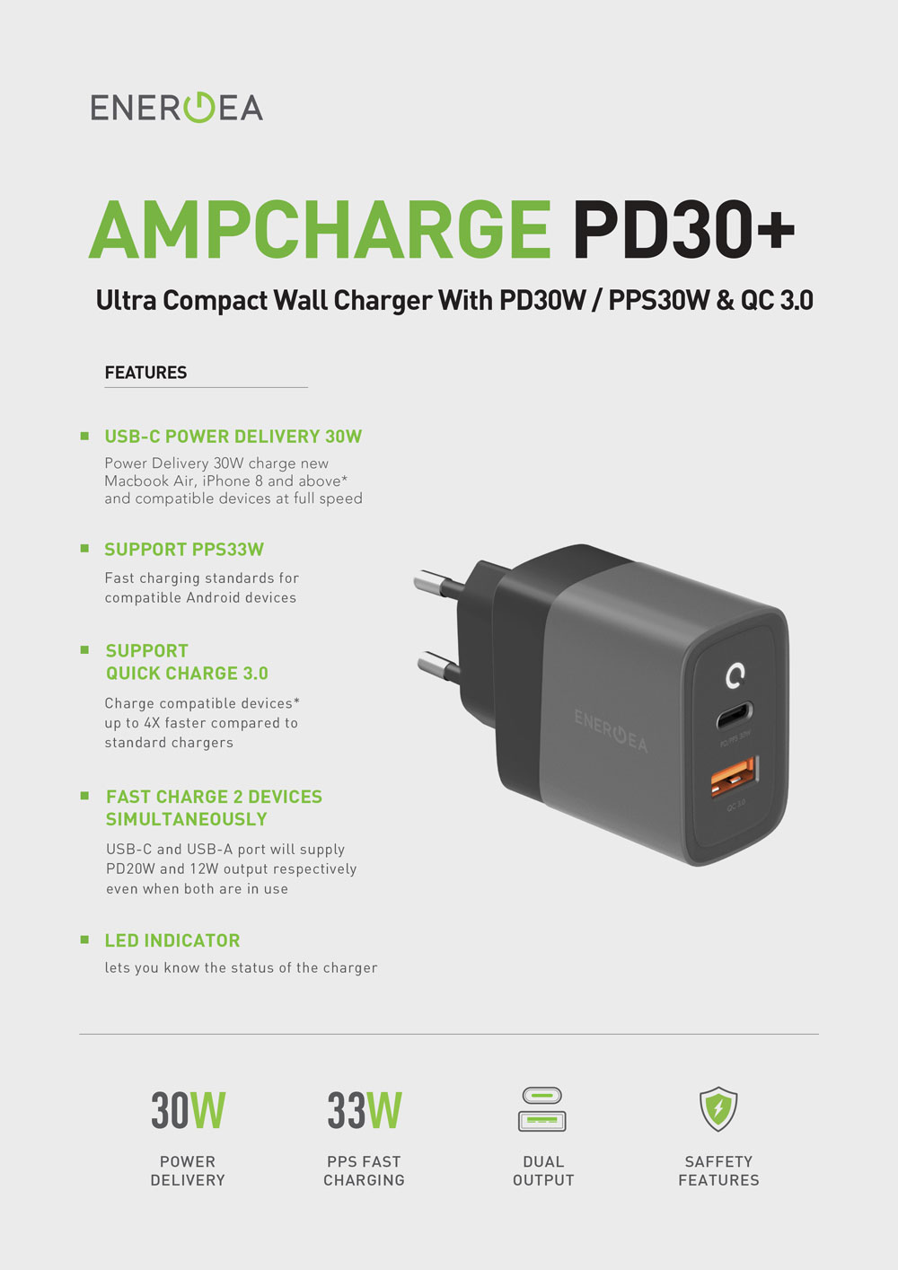 شارژر سریع انرژیا مدل AMPCHARGE PD30+ Power Delivery یک شارژر هوشمند با توانایی تشخیص توان دستگاه متصل شده به درگاه های خروجی می باشد. این شارژر می تواند از دو درگاه خروجی USB-A و USB-C دیوایس های شما را شارژ کند. همانطور که می دانیم برای شارژ سریع با توان بالای 20 وات باید از خروجی USB-C استفاده نماییم. شارژر دیواری سریع انرژیا با داشتن دو استاندارد مهم شارژ بر روی این درگاه یعنی PD3.0 و PPS می تواند آیپد ایر را با توان 30 وات و گوشی های آیفون سری 8 تا سری 13 را مطابق با استاندارد تعریف شده برای این گوشی ها یعنی شارژ 50 درصد توان گوشی در 30 دقیقه کاملا مشابه شارژر اصلی اپل شارژ نماید.