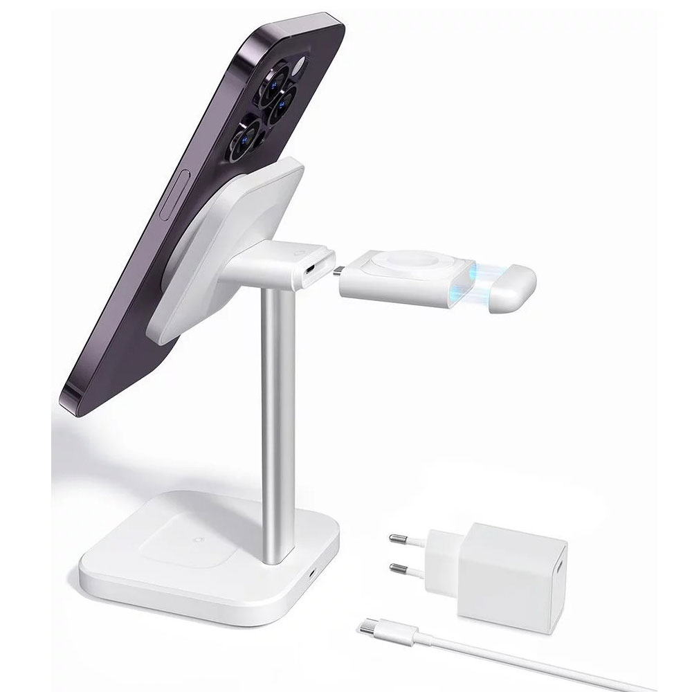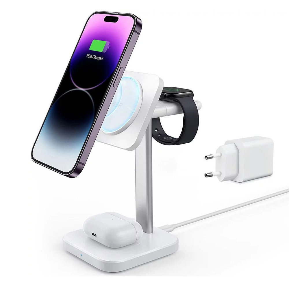 شارژ ۳-در-۱ با قابلیت مغناطیسی: این شارژر سازگار با شارژر MagSafe بوده و به شما امکان میدهد تا همزمان iPhone خود، AirPods و Apple Watch را شارژ کنید. سازگار با سری iPhone 15/14/13/12، AirPods Pro/3/2، Apple Watch Ultra، Apple Watch Series 8/7/6/5/4/3/2/1، و Apple Watch SE 2/1.