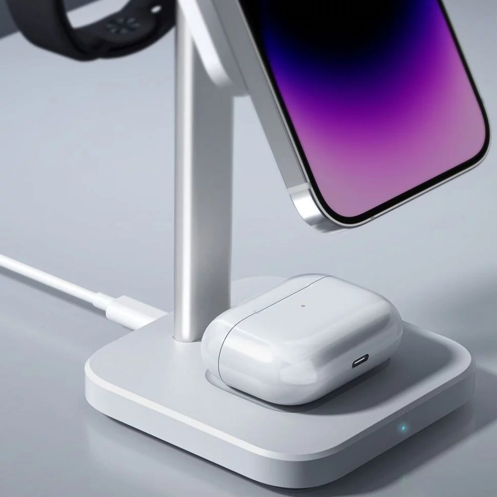 شارژ سه در یک: شارژر مغناطیسی MagSafe، شارژگر مغناطیسی برای Apple Watch، و شارژ بیسیم برای AirPods، کار را برای شما آسان کرده و به شما امکان میدهد تا همهی نیازهای روزانهتان را بهسرعت و آسان برآورده کنید. حفظ میز کارتان، آزاد کردن پریزها، و دور انداختن کابلهای پرپیچ و خم با یک راهحل شارژ گرفتن کامل و همهکاره.