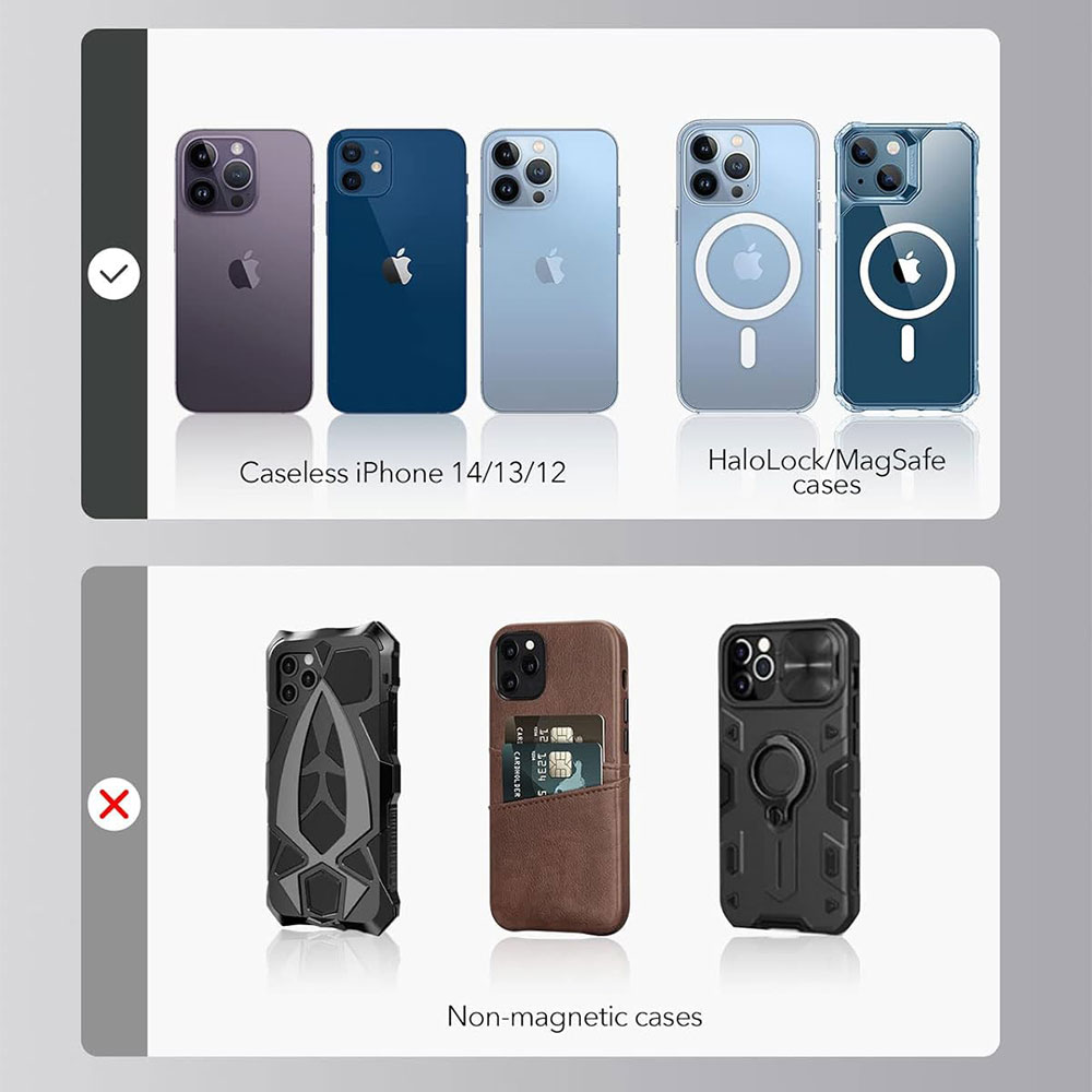 شارژر ESR Shift با تمامی گوشیهای سری iPhone 14/13/12 بدون کیس یا با استفاده از کیسهای MagSafe یا HaloLock کاملاً سازگار است. این ویژگی باعث میشود که کاربران بدون نگرانی از نحوه قرار گرفتن گوشی در شارژر، به شارژ سریع و کارایی بالا دست یابند.