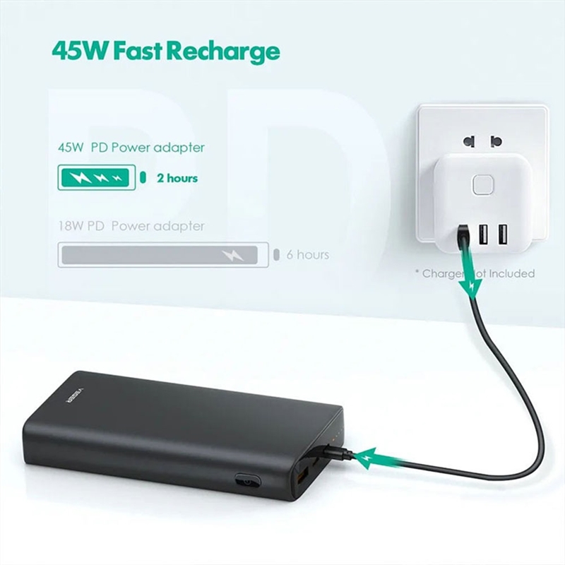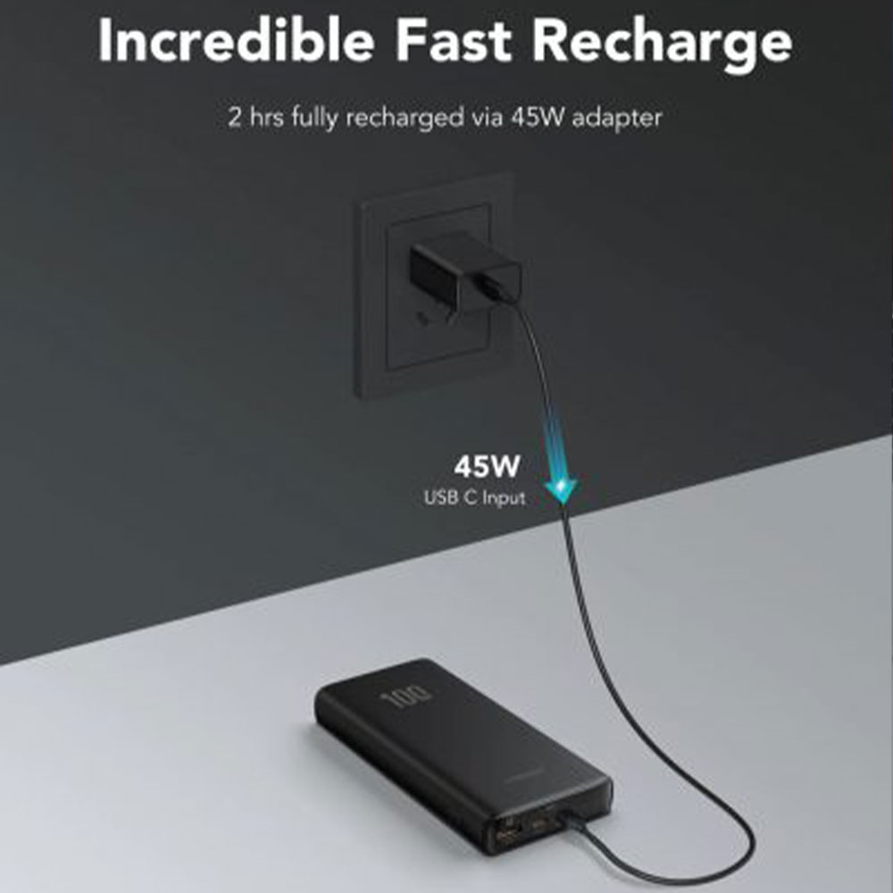 - شارژ سریع پاور بانک با توان PD45W در ۲ ساعت با استفاده از کابل Type-C به Type-C ارائه شده.